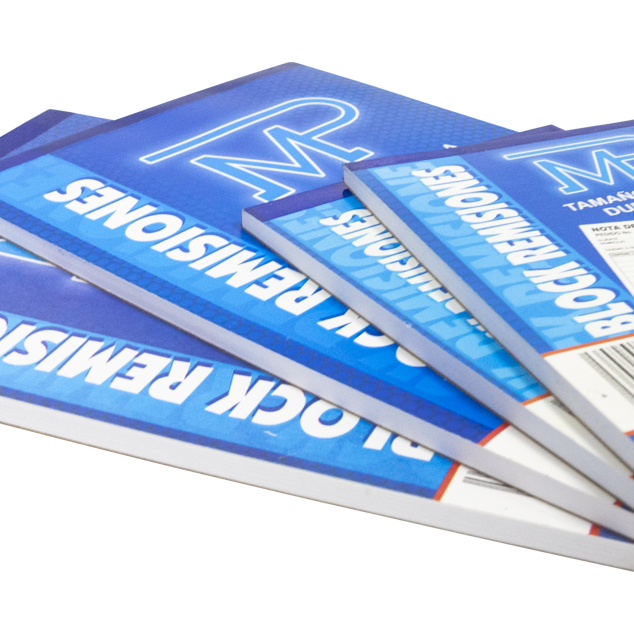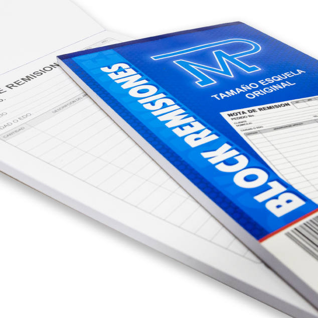 - Esquela, block de remisiones original y copia de 14 x 21.5 cm, con 25 hojas impresas en color negro (original) y 25 hojas impresas en color azul (copia).