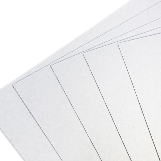 Cartulina rígida laminada en papel bond y papel kraft, en color blanco en ambas caras, la principal, martillada y el anverso liso. Se presenta en varios tamaños, absorbe tintas, y/o pinturas plásticas o acrílicas.